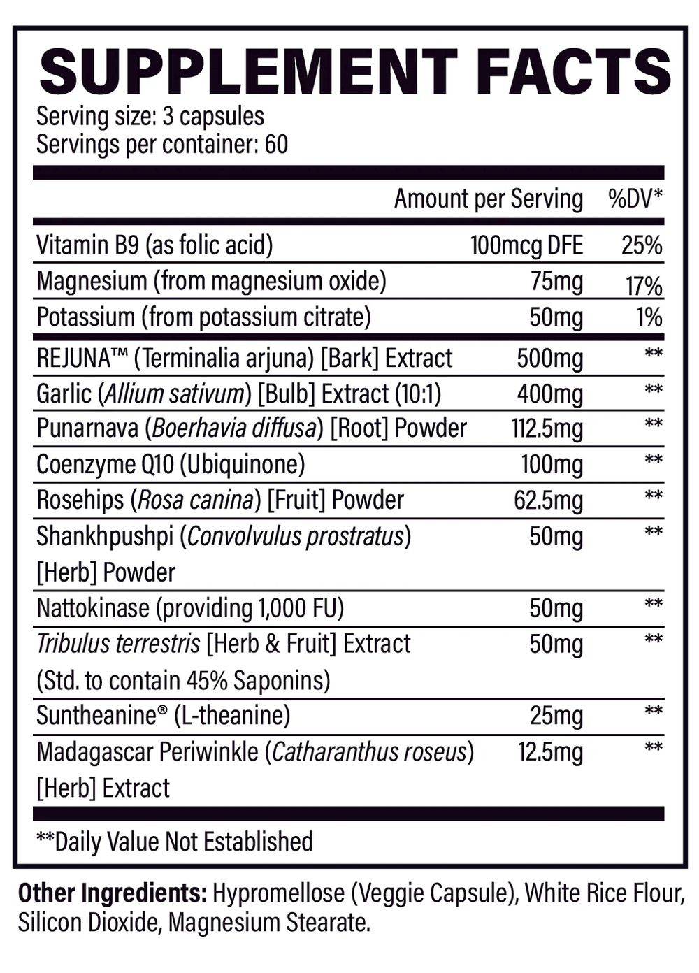 Our blood pressure capsules are made with a powerful combination of ingredients, including Arjuna (Rejuna™), Coenzyme Q10, Garlic, Suntheanine®, and a complete profile of herbs that offer blood pressure and cardiovascular support.