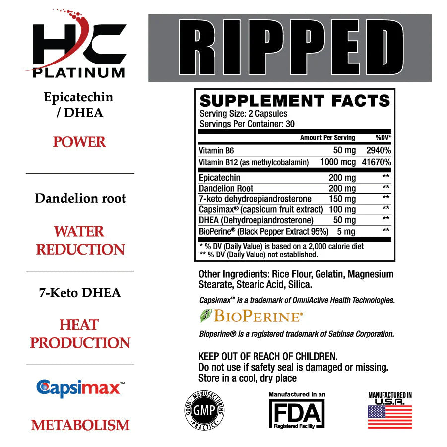 HARDCORE RIPPED: Non-stimulant thermogenic that boost BMR while increasing lean muscle mass production. Epicatechin works to inhibits myostatin helping the body boost strength levels while 7-KETO DHEA and CAPSIMAX work to shred the body. This is paired with Dandelion root to help reduce bloating and DHEA to help support natural testosterone levels.